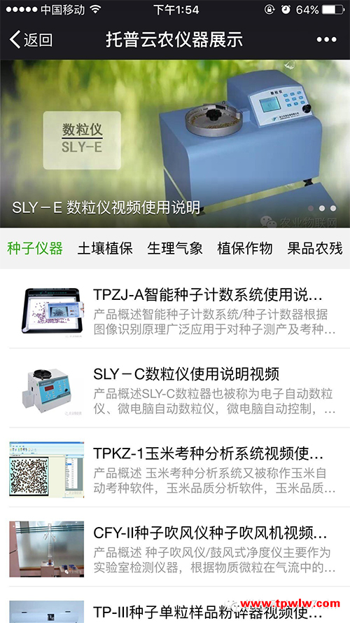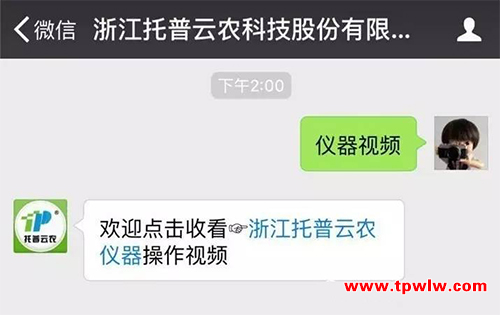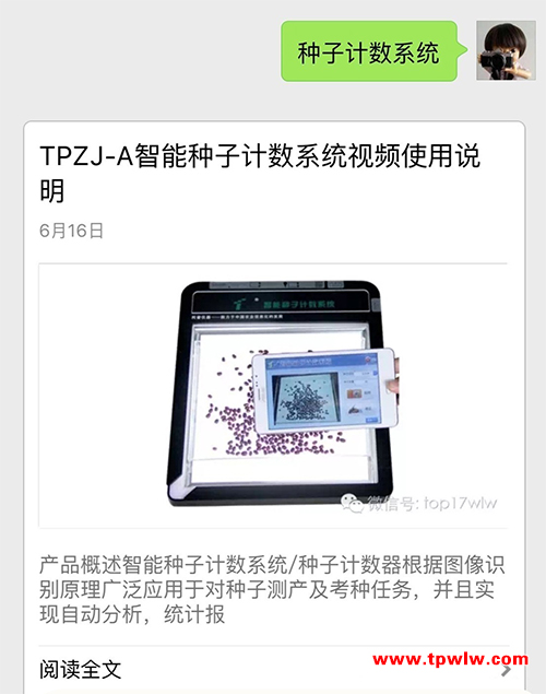 現(xiàn)在只需關注“浙江托普云農(nóng)科技股份有限公司”的微信公眾號,回復對應的關鍵字,即可查看儀器操作視頻,比如需要查看智能種子技術系統(tǒng)的操作視頻,只需要回復“種子計數(shù)系統(tǒng)”或者儀器型號即可了解如何使用儀器,查看儀器的相關參數(shù)和功能。