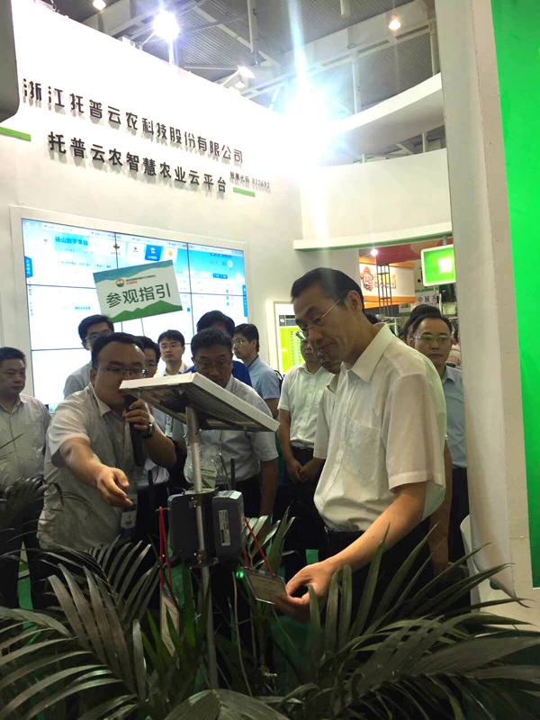 展會(huì)期間,南京市委常委、常務(wù)副市長劉以安,江蘇省農(nóng)業(yè)委員會(huì)副主任李俊超,南京市農(nóng)業(yè)委員會(huì)主任方中友,等人先后蒞臨托普展區(qū),參觀視察托普云農(nóng)農(nóng)業(yè)物聯(lián)網(wǎng)系統(tǒng)?,F(xiàn)場(chǎng)工作人員為其進(jìn)行詳細(xì)講解。工作人員以“碭山數(shù)字果園”為例,介紹了托普云農(nóng)在碭山數(shù)字果園從農(nóng)業(yè)生產(chǎn)、管理、農(nóng)產(chǎn)品銷售到農(nóng)產(chǎn)品質(zhì)量安全追溯等環(huán)節(jié)中所應(yīng)用的系統(tǒng)設(shè)施以及系統(tǒng)應(yīng)用后果園取得的效益,以點(diǎn)帶面具象化的介紹了智慧農(nóng)業(yè)實(shí)現(xiàn)節(jié)本增效的途徑。托普農(nóng)業(yè)物聯(lián)網(wǎng)的實(shí)施應(yīng)用受到了多方肯定。
