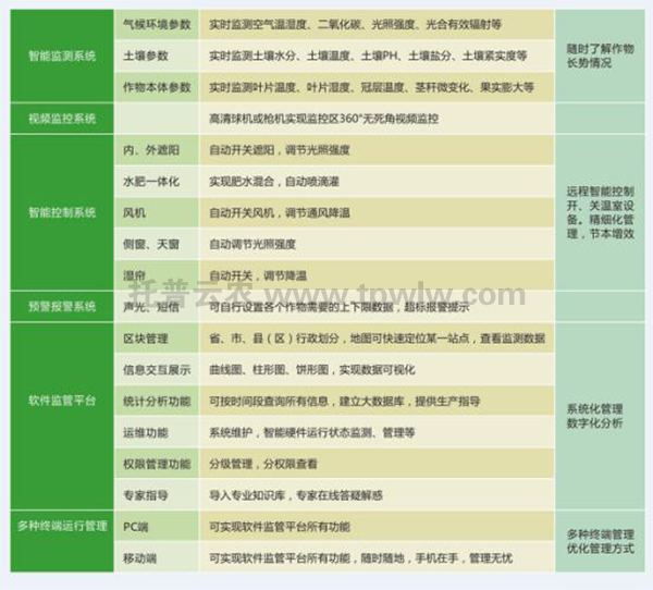智能化溫室擁有溫室環(huán)境智能監(jiān)控系統(tǒng),可以準(zhǔn)確地采集溫室內(nèi)大氣溫濕度、土壤溫濕度、光照強(qiáng)度、溶液濃度、二氧化碳濃度、風(fēng)向、風(fēng)速以及作物生長(zhǎng)狀況等參數(shù),將室內(nèi)溫、光、水、肥、氣等諸多因素綜合,根據(jù)不同作物、作物不同生長(zhǎng)階段對(duì)環(huán)境因子的不同要求,通過執(zhí)行機(jī)構(gòu)協(xié)調(diào)到最佳狀態(tài),節(jié)能最高可達(dá)50%,并有節(jié)水、節(jié)肥、節(jié)藥的效果。
