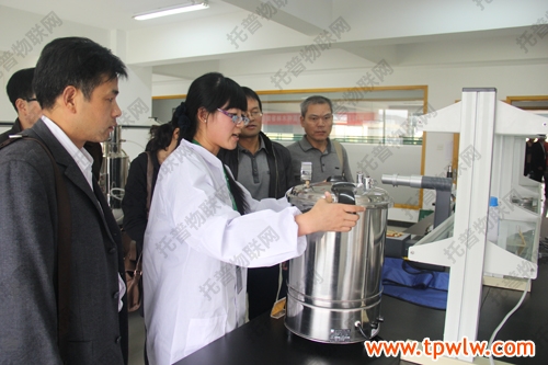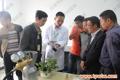 圖為:參會嘉賓在樣品室聽取托普農業(yè)物聯(lián)網(wǎng)介紹,并表現(xiàn)出了對該系統(tǒng)的濃厚興趣