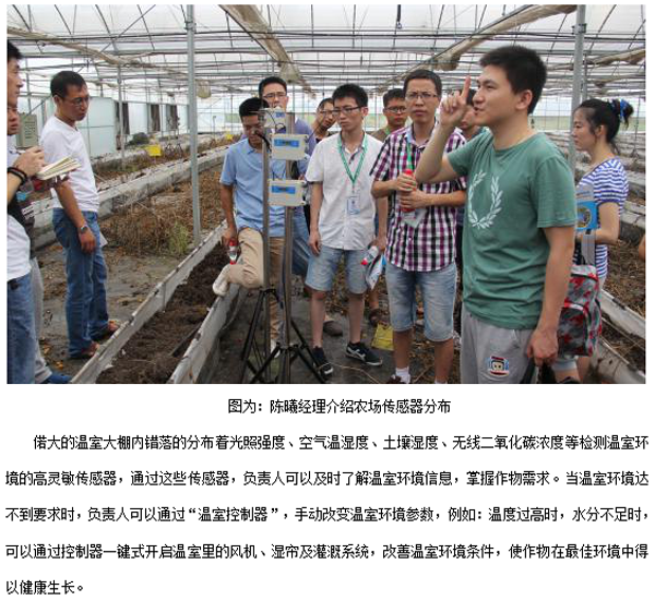 喬司農(nóng)場是浙江省首家集規(guī)模種植、科研生產(chǎn)、網(wǎng)絡(luò)銷售、宅配服務(wù)為一體的國家級農(nóng)業(yè)綜合開發(fā)綠色蔬菜生產(chǎn)基地。2014年4月中旬,托普物聯(lián)網(wǎng)系統(tǒng)在喬司農(nóng)場成功搭建運(yùn)行。 隨后的8月2日,銷售部全體員工在時(shí)任營銷經(jīng)理陳曦的帶領(lǐng)下前往喬司農(nóng)場,觀看農(nóng)場內(nèi)的物聯(lián)網(wǎng)系統(tǒng)運(yùn)行情況。