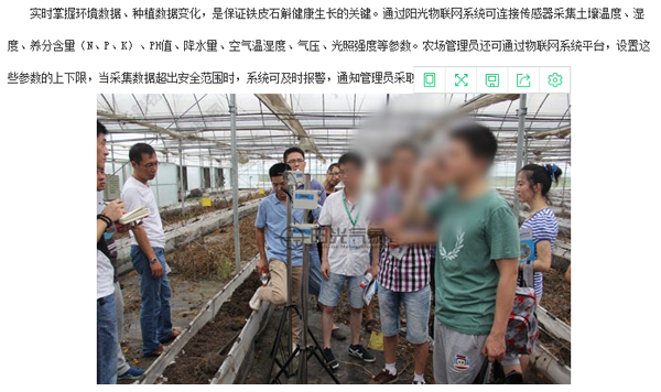 在《陽光物聯(lián)網(wǎng)引領(lǐng)仙草(鐵皮石斛)種植新方式》一文中,不僅“學(xué)習(xí)”物聯(lián)網(wǎng)系統(tǒng)的建設(shè)原理,以及操作方式外,還引用當(dāng)時(shí)參觀時(shí)拍攝的圖片。為了降低圖片的辨識(shí)度,還對圖片進(jìn)行模糊處理。