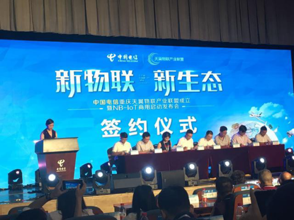 中國電信重慶天翼物聯(lián)產業(yè)聯(lián)盟成立暨NB-IoT商用啟動發(fā)布會現(xiàn)場的簽約儀式