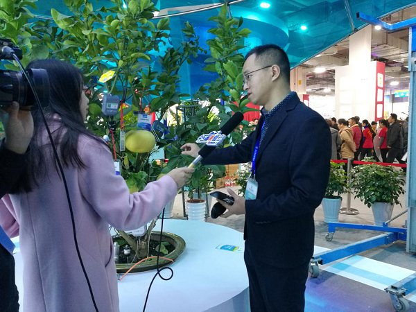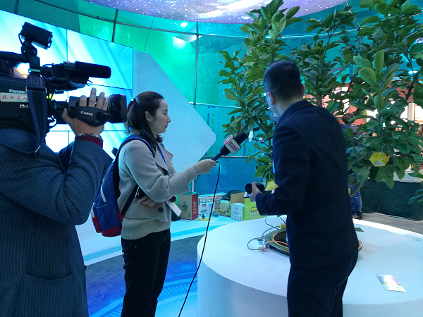 展會現(xiàn)場掛上傳感器的文旦樹“在這棵文旦樹上,我們安裝了無線葉面溫度傳感器、光照強度傳感器、果實膨大傳感器。通過這些傳感器采集傳輸?shù)臄?shù)據(jù),我們就能知道整個樹的生長秘密”。展會現(xiàn)場,現(xiàn)代農(nóng)業(yè)與信息化的互融發(fā)展,吸引浙江衛(wèi)視、杭州電視臺、蕭山日報、舟山電視臺、金華電視臺等記者前來采訪。