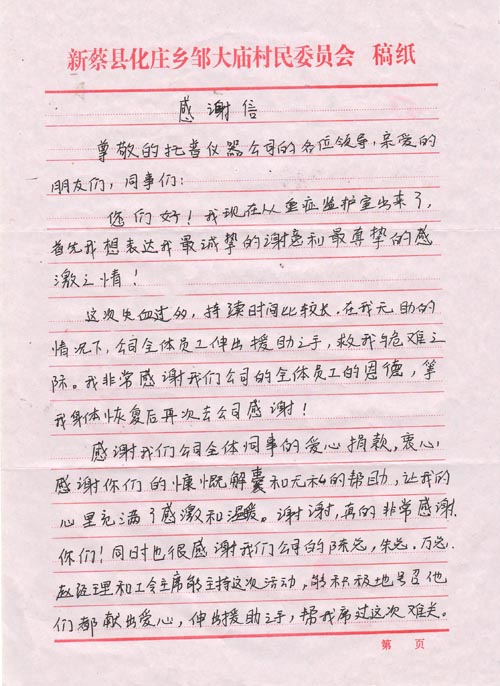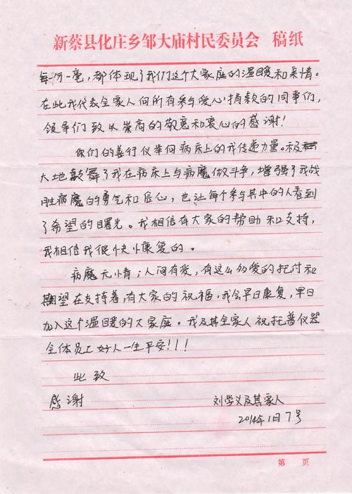1月15日,公司收到劉學義寫來的信,信中他告訴托普家人他的病情已好轉,術后已由重癥監(jiān)護室轉入普通病房,等待觀察與休養(yǎng)。長長的一封信,給同事們帶來了喜悅的消息,也傾訴著他對托普家人的深深謝意!