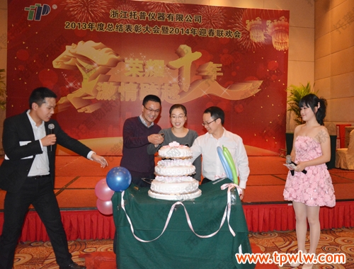 年會(huì)晚宴進(jìn)行到中段,工作人員推上來(lái)一個(gè)漂亮的三層蛋糕,陳總、婷姐、朱總?cè)艘黄鹎虚_蛋糕,為托普十周歲生日慶賀。每一位托普家人臉上都綻開幸福的笑容,口中輕唱著歡樂(lè)的生日歌,為托普儀器的成長(zhǎng)送去誠(chéng)摯的祝福。