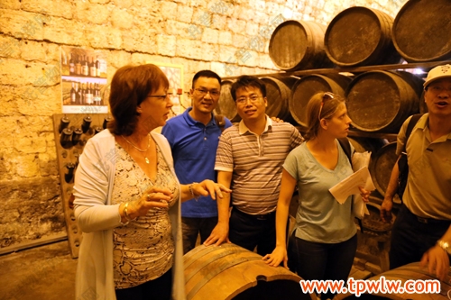 圖為:托普儀器陳渝陽(yáng)總經(jīng)理(左二)隨考察團(tuán)參觀葡萄酒廠