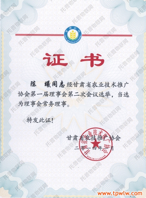 圖為:托普儀器陳曦經(jīng)理任甘肅省農(nóng)業(yè)技術(shù)推廣協(xié)會(huì)常務(wù)理事證書