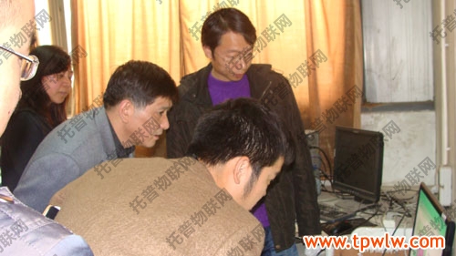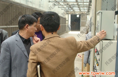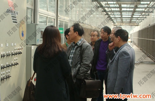 圖為:托普工作人員在介紹通過網(wǎng)絡(luò)來控制種植大棚里的各項(xiàng)指標(biāo),右二:戴守勤副處長(zhǎng)