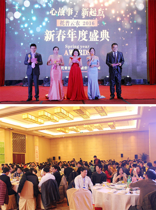 羊隨新風辭舊歲,金猴獻瑞迎新春。2016年1月30日,“新起點 新起航——托普云農(nóng)2015年度總結(jié)表彰大會暨2016迎新春聯(lián)歡會”在杭州海外?!ぜ{川大酒店隆重舉行。300余名托普家人共聚一堂,回顧這一年所取得的成績,規(guī)劃2016年新的奮斗目標,共同迎接歡樂幸福的農(nóng)歷新年。
