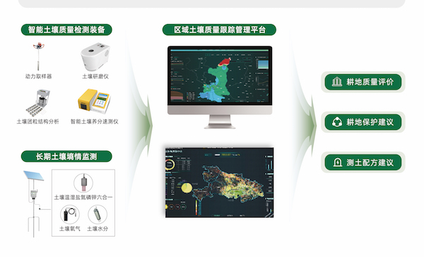 農(nóng)田耕地質(zhì)量監(jiān)測管理在土地平整、農(nóng)田整治的基礎(chǔ)上,利用耕地質(zhì)量監(jiān)測智能化裝備與土壤傳感器體系采集土壤理化相關(guān)指標(biāo)、土壤含水量、區(qū)域農(nóng)業(yè)氣象等數(shù)據(jù),實(shí)現(xiàn)田間地情、肥情、環(huán)情、墑情的監(jiān)測分析。聯(lián)動(dòng)應(yīng)用區(qū)域土壤質(zhì)量跟蹤管理平臺,為耕地監(jiān)管單位建立數(shù)字化管理體系,實(shí)現(xiàn)高標(biāo)農(nóng)田耕地質(zhì)量的長效化、動(dòng)態(tài)化、智能化監(jiān)測與管理。
