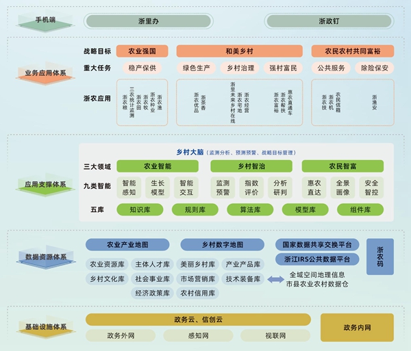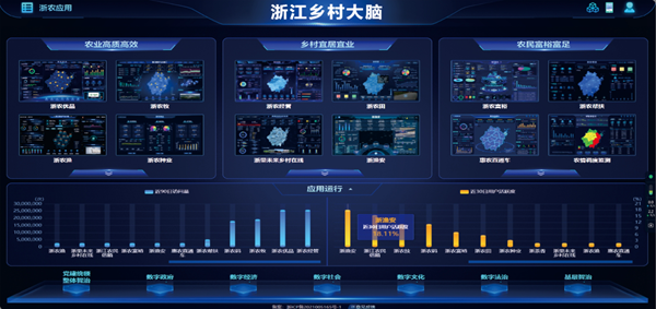 浙江省農(nóng)業(yè)農(nóng)村廳圍繞省委數(shù)字化改革決策部署,聚焦大腦監(jiān)測分析評價、預(yù)測預(yù)警和戰(zhàn)略目標(biāo)管理能力的新目標(biāo),大力推進"浙江鄉(xiāng)村大腦 +浙農(nóng)系列應(yīng)用"體系建設(shè),迭代形成以"11153"核心構(gòu)架為支撐的"浙江鄉(xiāng)村大腦"(1個數(shù)據(jù)倉,1張全域地理信息圖,1個"浙農(nóng)碼”,5個庫為知識庫、規(guī)則庫、算法庫、模型庫和組件庫,3領(lǐng)域能力為農(nóng)業(yè)智能、鄉(xiāng)村智治、農(nóng)民智富),按照'一表一圖N清單"的方法,開發(fā)建設(shè)9個智能模塊,以數(shù)字技術(shù)助力農(nóng)業(yè)農(nóng)村現(xiàn)代化、鄉(xiāng)村振興和農(nóng)民農(nóng)村共同富裕。目前,"浙江鄉(xiāng)村大腦"已實現(xiàn)省市縣三級貫通。